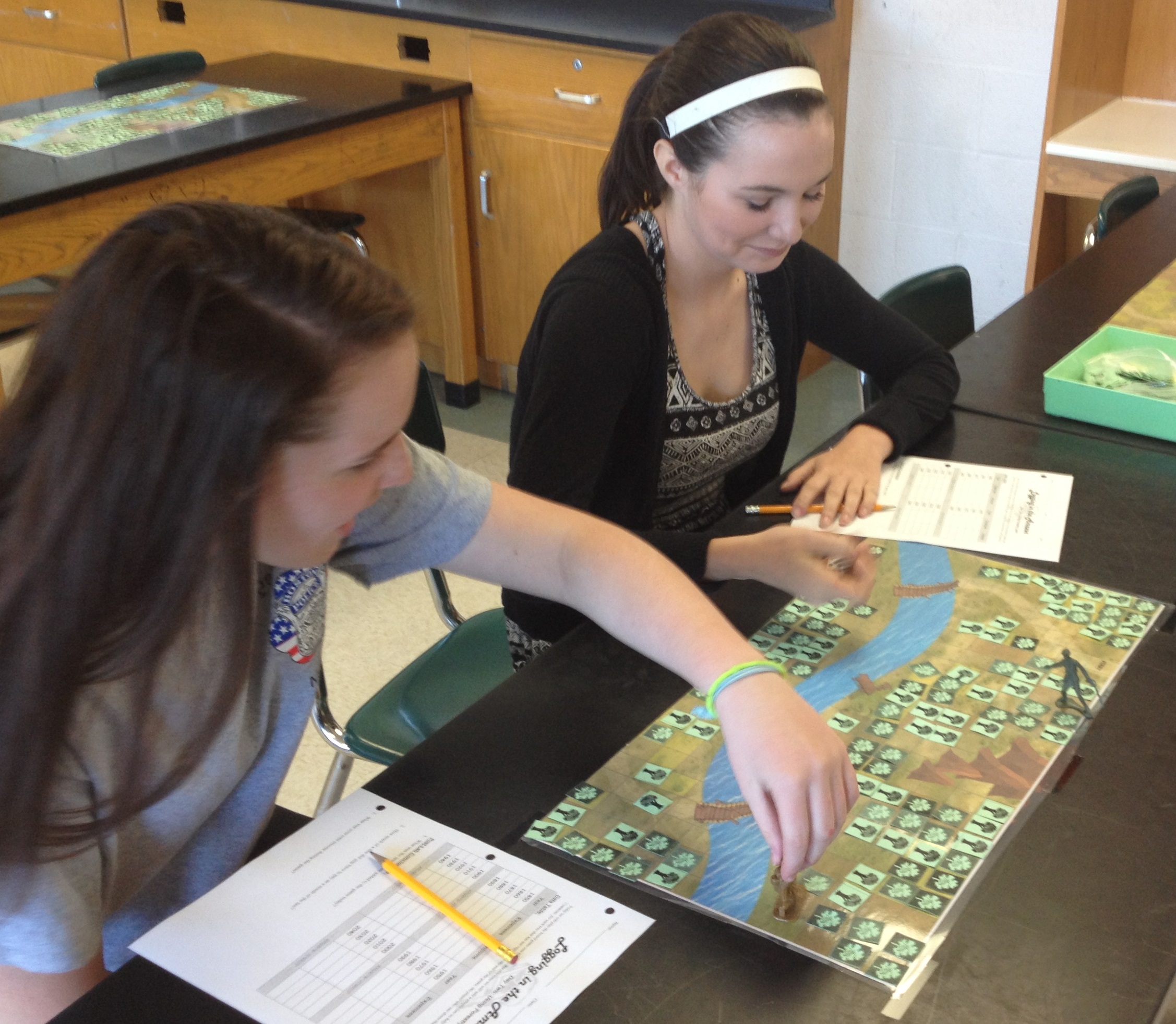 Today in class, students were asked to play the board game again. But this time, they were encouraged to use sustainable forestry practices through the addition of a new law: for every tree that did not grow back by the end of the game, students were fined $175. In most cases, this was all the encouragement they needed. Instead of clearing large swaths of land, students zig-zagged their way across the forests, cutting only small patches and leaving the ecosystem intact.