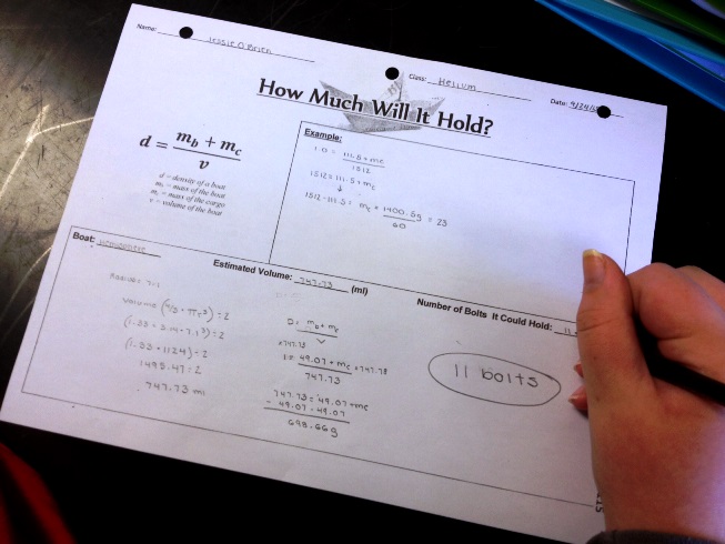 For the next two days in class, students will be attempting to answer the question “How Much Will It Hold?” for seven different objects. They will measure the object’s volume, weigh it, and solve the equation to figure out the maximum mass it could support before sinking. Then they will divide by 60 to try to predict how many of the 60 gram bolts that could be. At the end of class on Monday, we will get out the aquarium and test each of the seven objects to see if their predictions were right.
