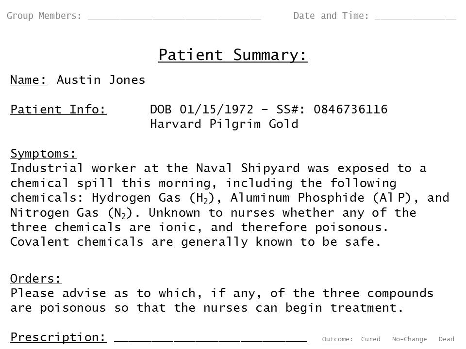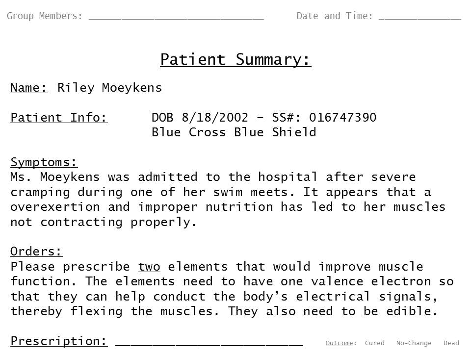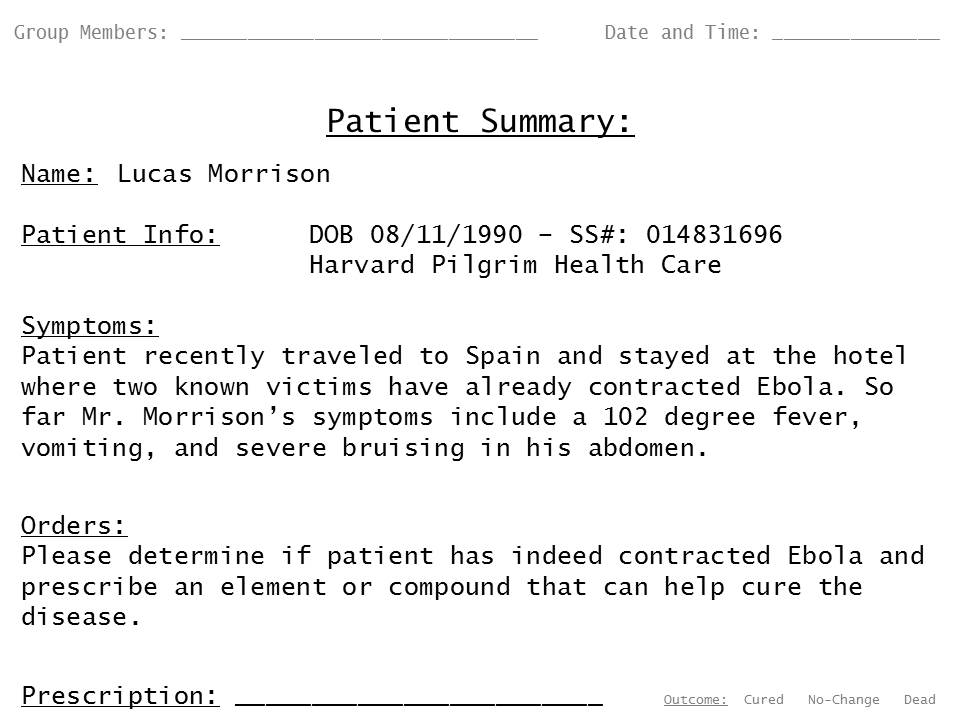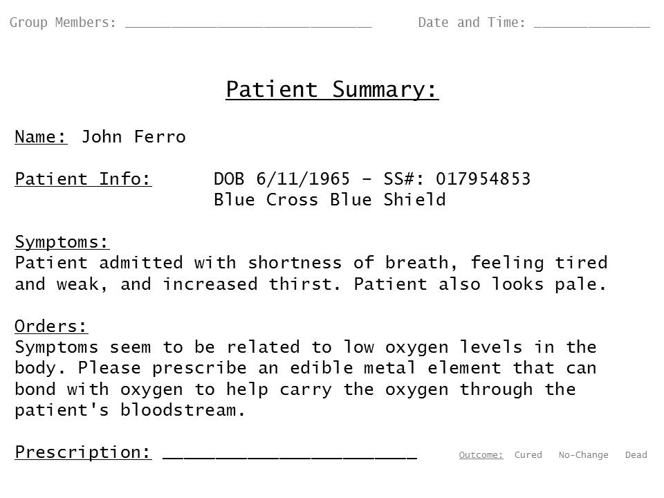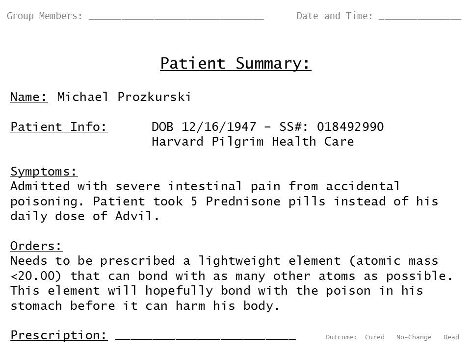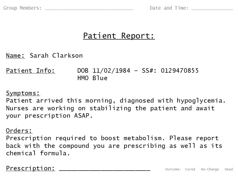On Thursday, students will get the results of their prescriptions back. Then each team will have to reflect on what happened, analyzing what went right and what went wrong. Their findings will be published in the Medical Report that each group will create. If any students need to review any of the eight patients, their information is below.